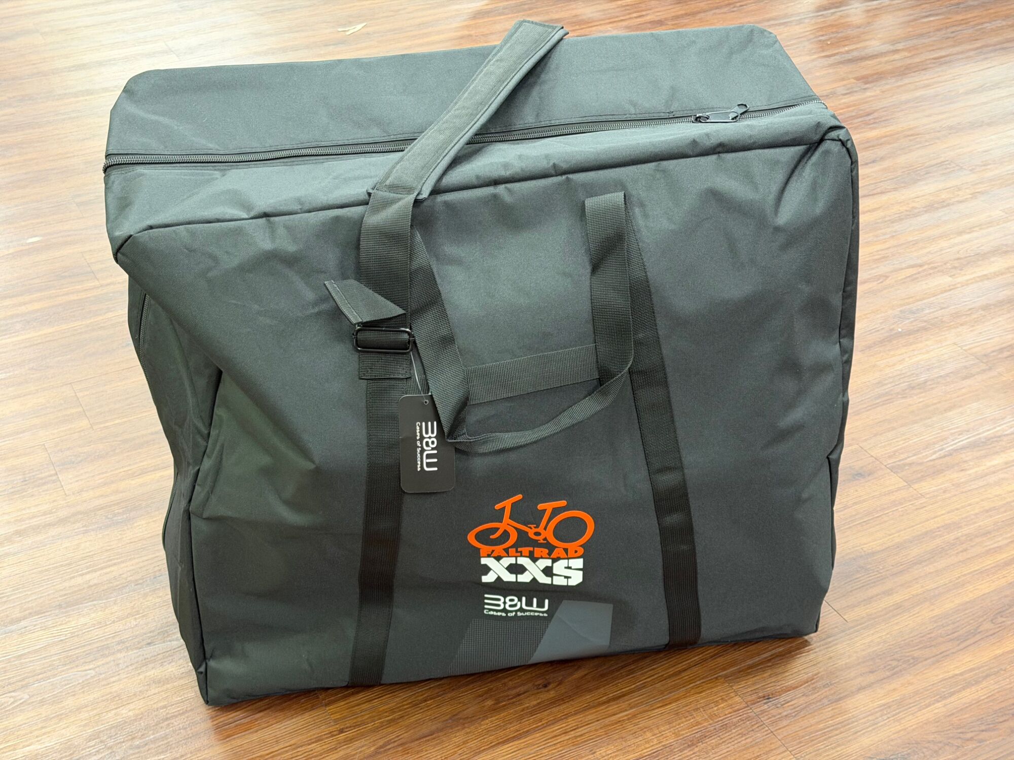 Bei dieser Tasche kann man die Reißverschlüsse bis auf den Boden aufziehen, dann wird das Faltrad auf die Bodenfläche gestellt und einfach der Reißverschluss an beiden Seiten hochgezogen. Das kann man auch super alleine machen. Bei anderen Taschen ( Stow Bag ) kann man den Reißverschluss nur an zwei Seiten öffnen und braucht zwei zusätzliche Hände zum verstauen.