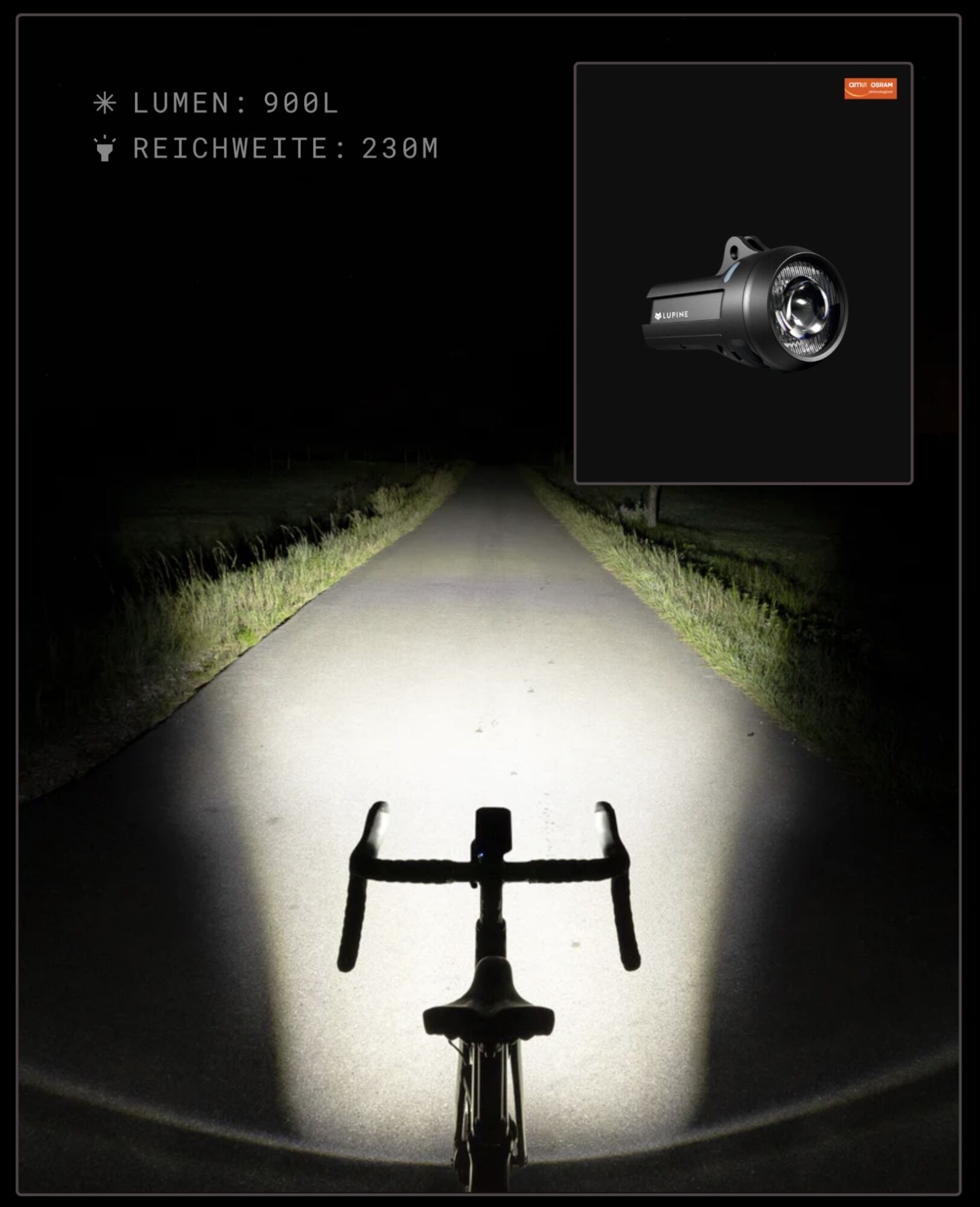 Sie verfügt über ein Tagfahrlicht mit 150 Lumen, zwei Stufen Abblendlicht mit 350 und 900 Lumen und einen Umgebungslichtsensor,